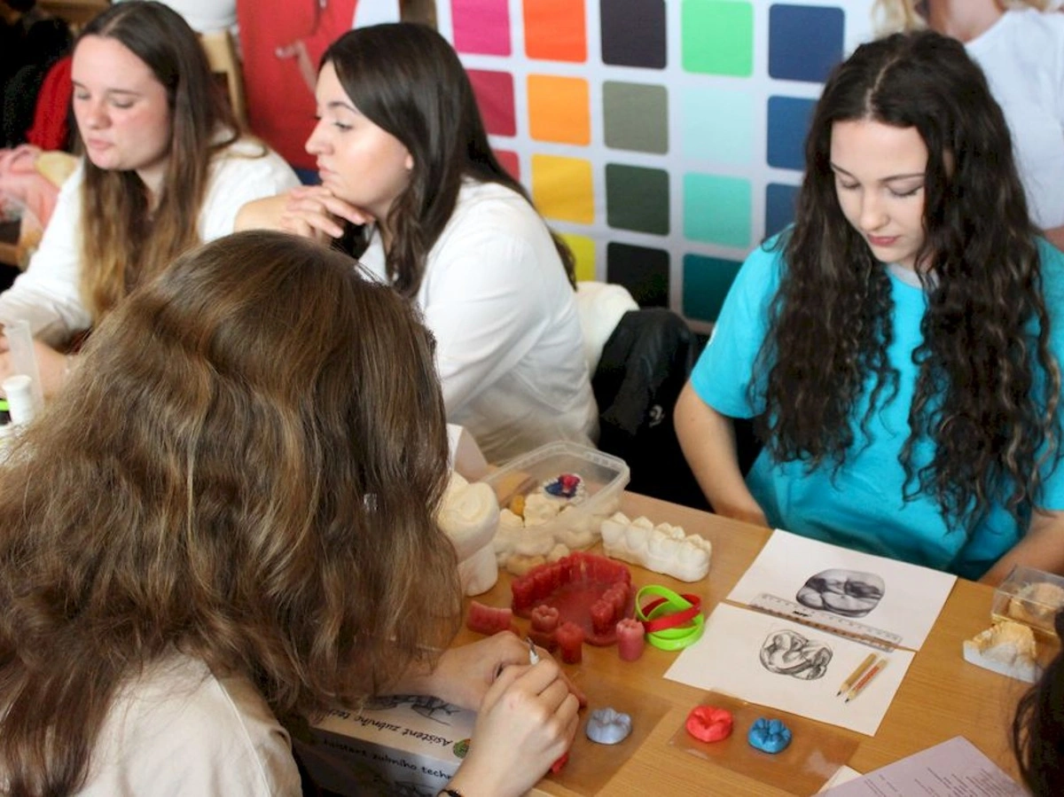 Děvčata si na veletrhu zkoušela u stánku ústecké zdrávky svou manuální zručnost. Foto: Ústecký kraj