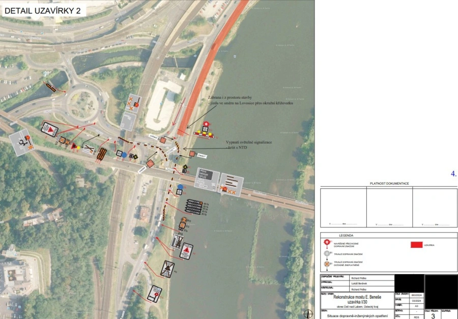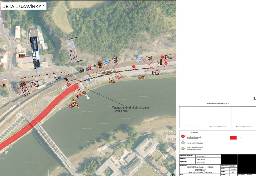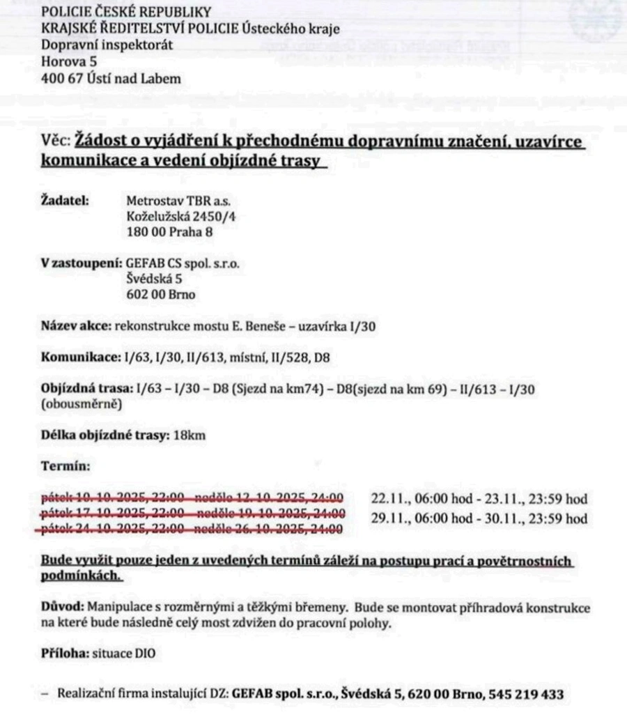 Dokument uvádí, že v plánu je víkend 22. a 23. listopadu nebo 29. a 30. listopadu. „Bude využit pouze jeden z uvedených termínů, záleží na postupu prací a povětrnostních podmínkách,“ žádá o povolení firma realizující dopravní opatření při rekonstrukci mostu Dr. Edvarda Beneše.