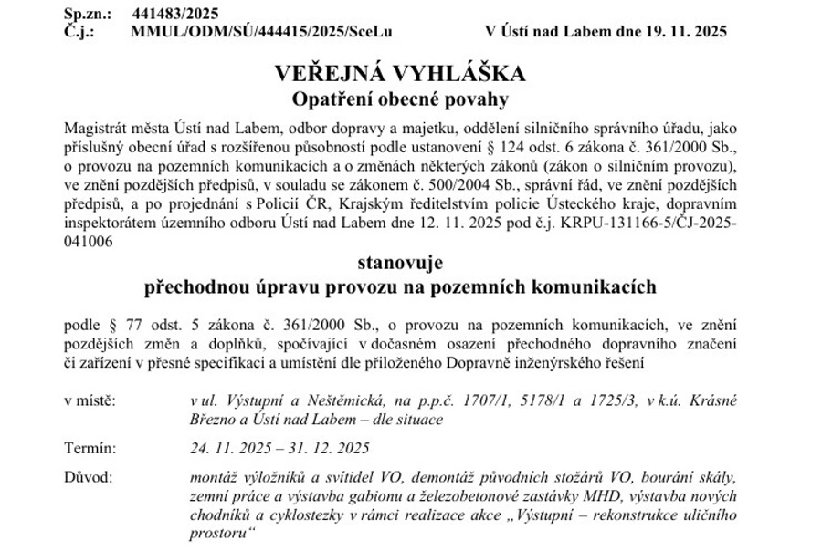 Ústí nad Labem – Na usměrnění silničního provozu od pondělí 24. listopadu narazí motoristé projíždějící Výstupní ulicí spojující městské části Krásné Březno a Dobětice. Informaci směrem k veřejnosti zveřejnil ústecký magistrát.