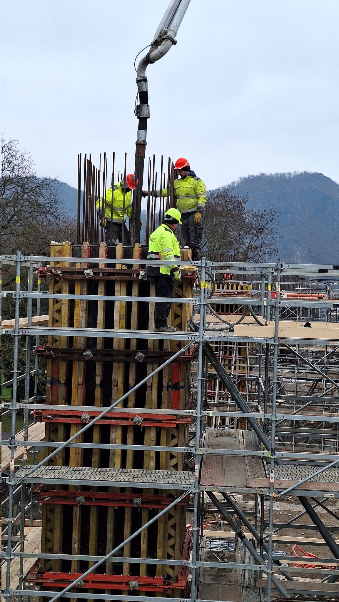 Každý pilíř má 2 dříky, v jednom je 20–34 m³ betonu, celkem cca 100 m³. Práce probíhají za úplné uzavírky až do podzimu 2026. Ředitelství silnic a dálnic děkuje všem řidičům za trpělivost.