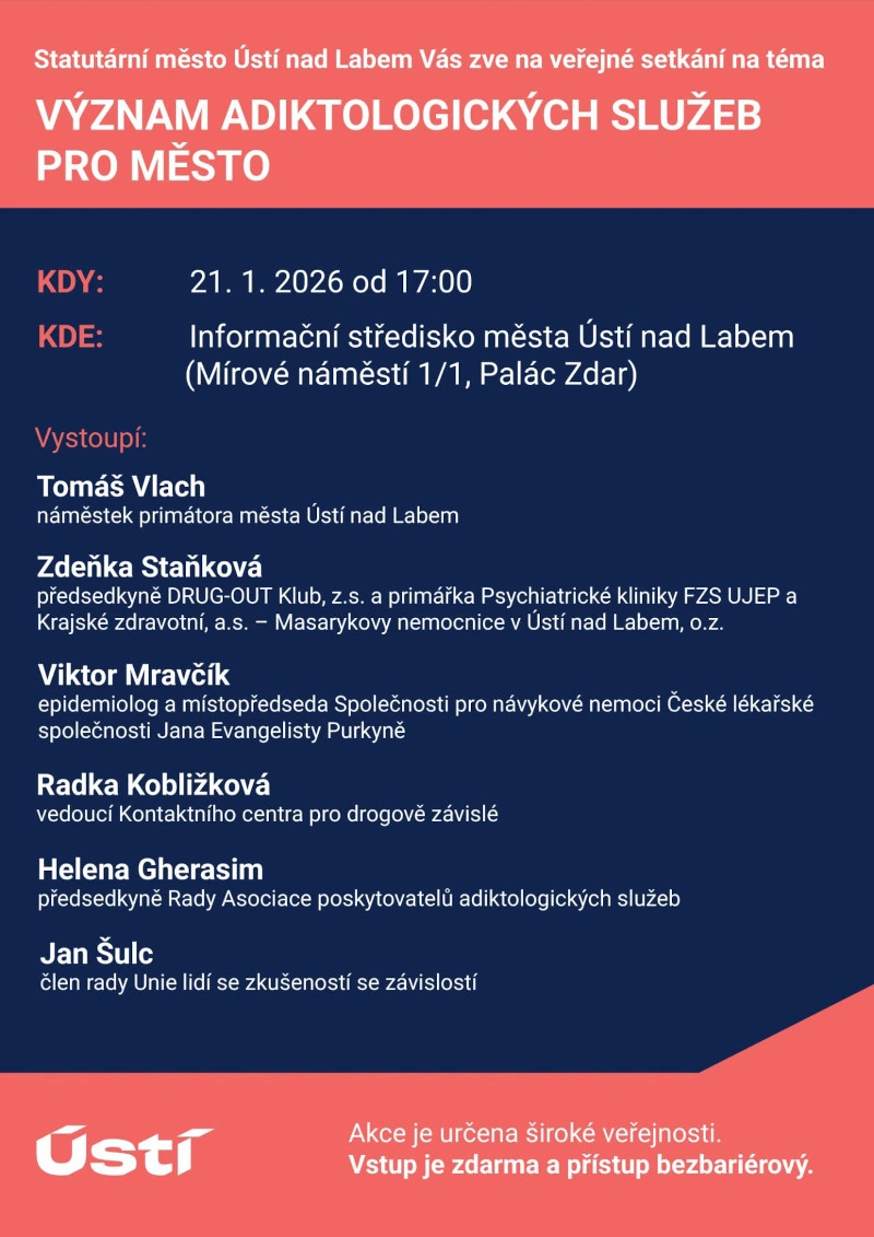 Akce je určena široké veřejnosti, vstup je zdarma a místo konání je bezbariérově přístupné. Setkání nabízí příležitost dozvědět se více o fungování adiktologických služeb v Ústí nad Labem a zapojit se do otevřené debaty o jejich významu pro město i jeho obyvatele.