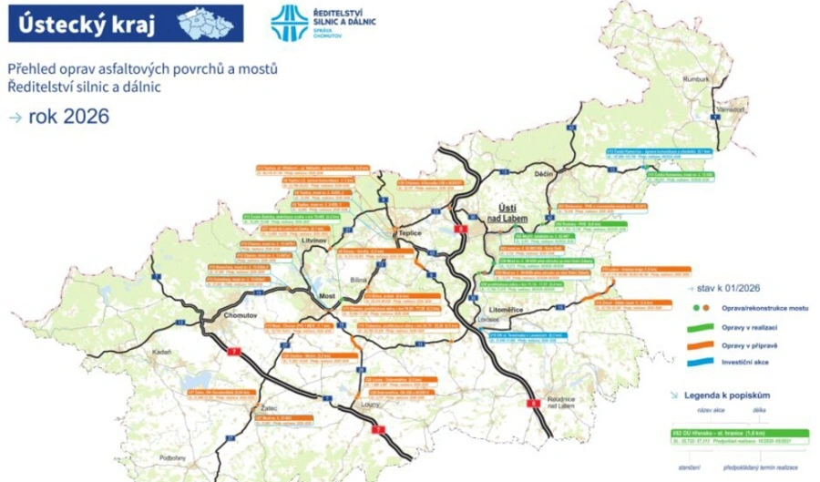 Ústecko - Nová stavební sezóna je tu. Přípravy vrcholí a s příchodem jara začneme v Ústeckém kraji s další vlnou oprav na silnicích I. třídy i na dálnicích. To jsou věty z tiskové zprávy Ředitelství silnic a dálnic (ŘSD), ve které státní podnik informuje o plánovaných stavebních akcích v Ústeckém kraji.