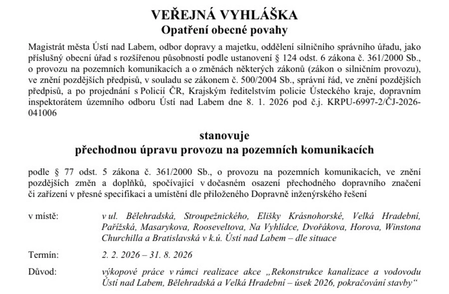 Začne další etapa realizace akce „Rekonstrukce kanalizace a vodovodu Ústí nad Labem, Bělehradská a Velká Hradební – úsek 2026, pokračování stavby“. Dopravní opatření je naplánováno od 2. února do 31. srpna.