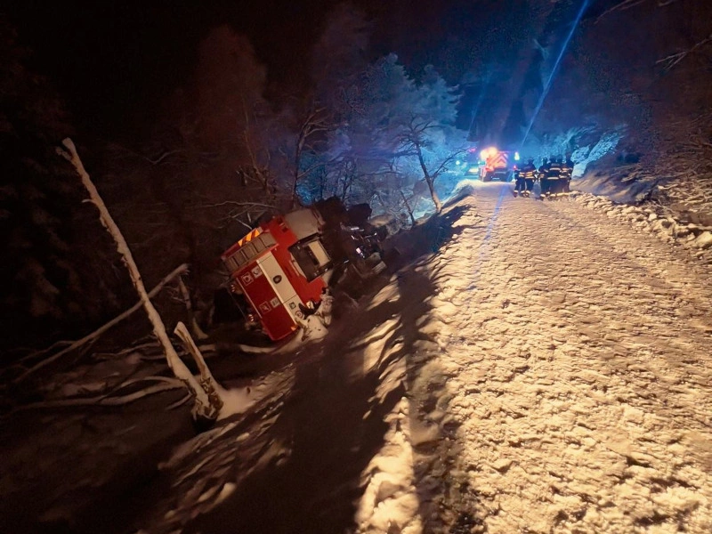 Ještě než se jednotky dostaly k původní nehodě, došlo k další komplikaci. Cisterna dobrovolných hasičů z Jílového na zasněžené a kluzké vozovce sjela ze silnice a převrátila se na bok. Místo zásahu se tak nečekaně proměnilo ve dvě paralelní dopravní nehody, které se staly nedaleko Drážďanské vyhlídky.