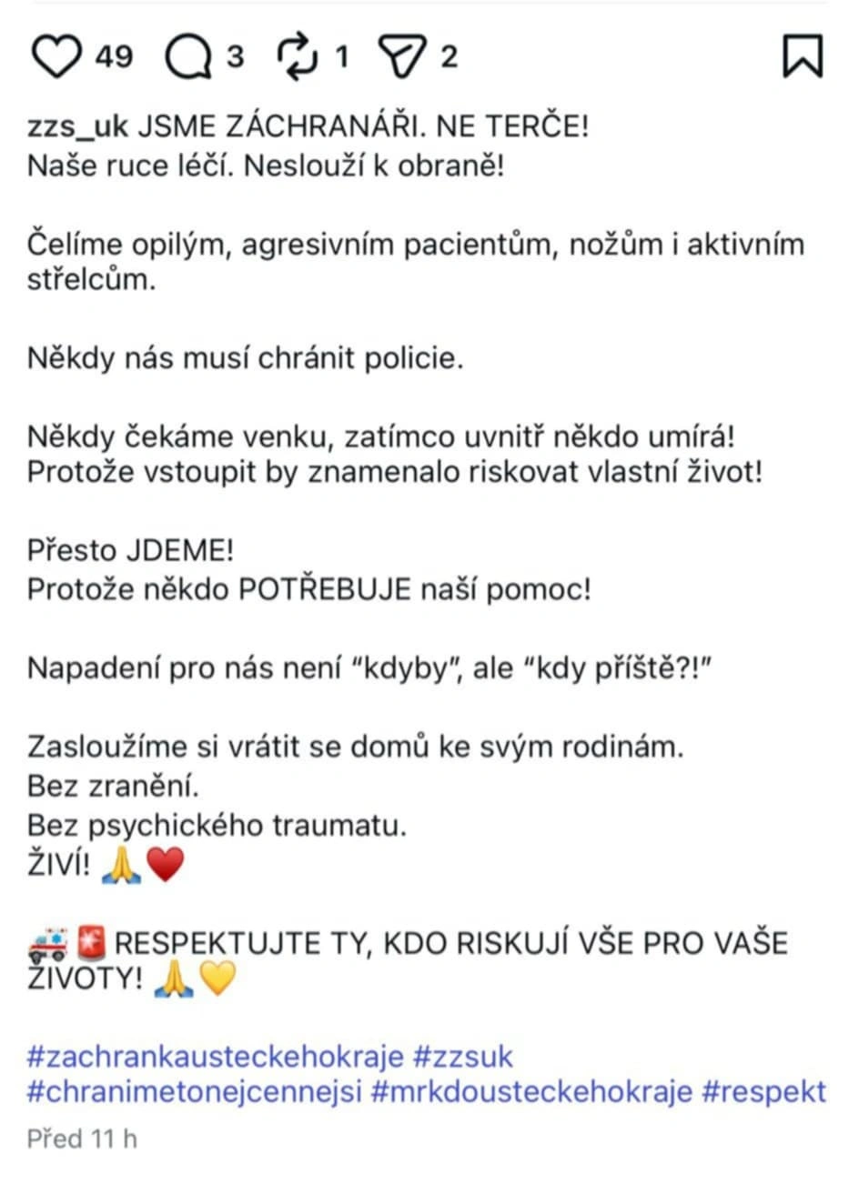 Na problematiku záchranáři upozornili i na Instagramu s heslem Jsme záchranáři. Ne terče!