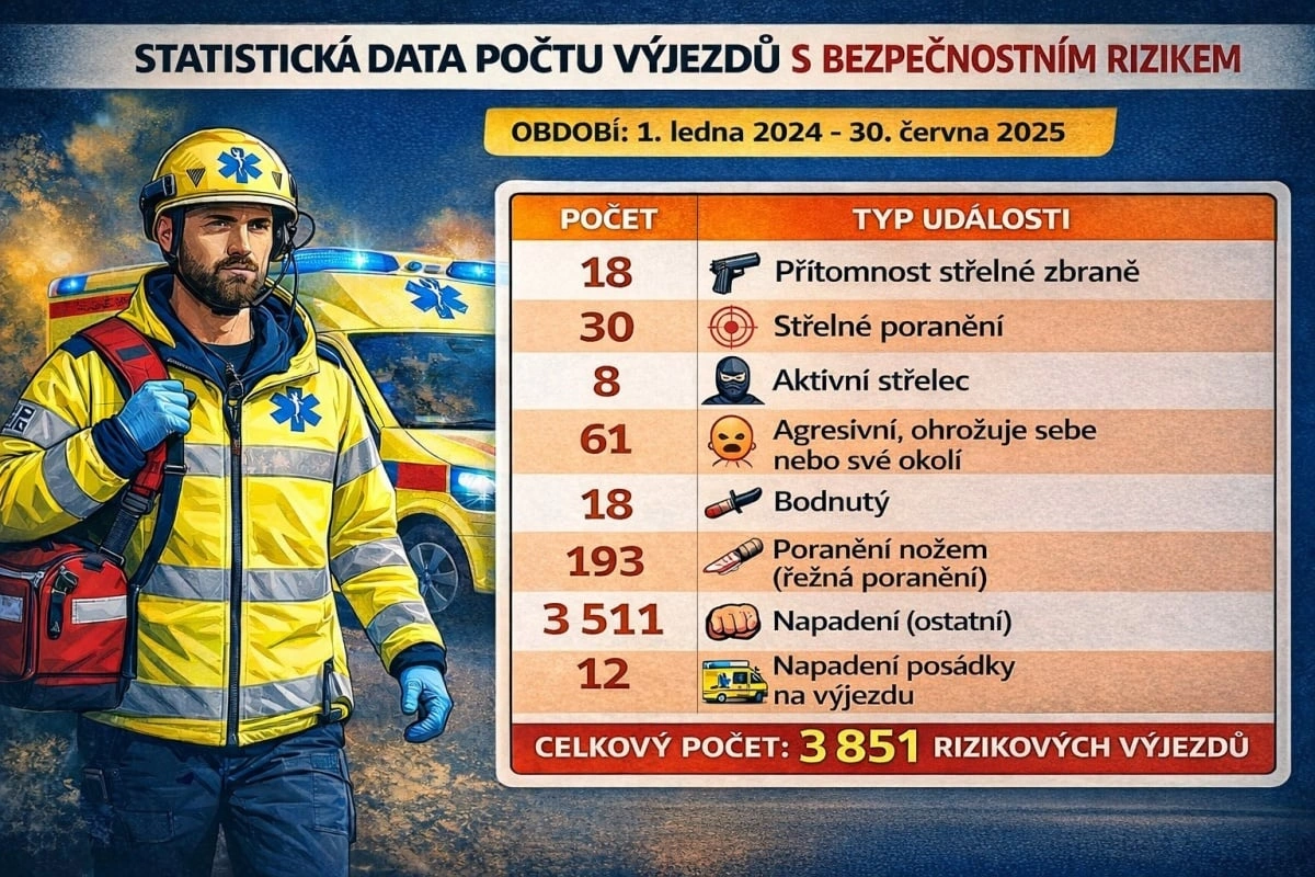Statistiky za uplynulé období hovoří jasně. Od 1. ledna 2024 do 30. června 2025 bylo v Ústeckém kraji vyhodnoceno celkem 3 851 událostí jako potenciálně rizikových. Za každým tímto číslem stojí konkrétní situace, kdy museli zdravotníci zachovat chladnou hlavu, profesionalitu a dbát na svou bezpečnost, ať už šlo o agresivní chování, fyzické napadení nebo přítomnost zbraní.