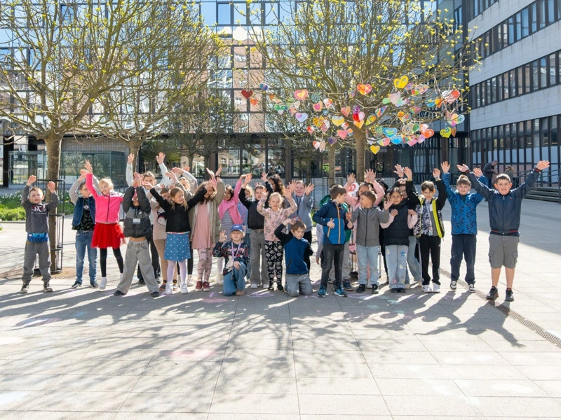 Na strom v atriu děti zavěsily vlastnoručně vyrobená papírová srdíčka, okolní prostor pak oživily křídové kresby, vzkazy a symboly lásky přímo na zemi. Atmosféru navíc v těchto dnech jemně podtrhují kvetoucí tulipány, které atrium doslova prozáří barvami a umocňují pocit jara uprostřed městského ruchu.