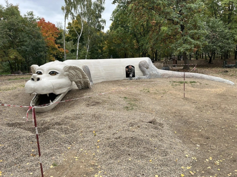 Bílina - Pohádkový les v Bílině se pyšní novým lákadlem pro malé i velké návštěvníky - sochou legendárního psa Falca z kultovního filmu Nekonečný příběh, na kterém pracovali řezbáři v posledních dnech. Nový prvek se okamžitě stal dominantou areálu a oblíbeným místem pro fotografie i odpočinek.